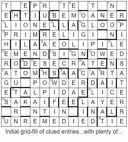 And that opinion was largely borne out. The five unclued entries had plenty of crossers, once the grid started to fill up, with 1A looking likely to be THE. However, I did grind to a bit of a crawl, not helped by quite a few obscure/new to me words that needed some checking once parsed/fitted/guessed.