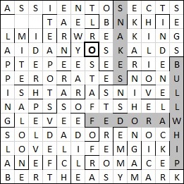 3. I enjoyed solving this none-too-easy crossword, and it was satisfying to complete the grid, collecting all 16 letters as I did so. I got into a bit of difficulty in the top left before I realised that the 3-letter space was there, and there were some difficult clues like EDILE, where there was an obscure word as the answer as well as in the build-up (SEDILE).
