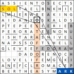 I filled in the three unclued entries and identified the 3-letter item that had to ‘rise’, but I had to look up the subject to learn more about the theme. I found, and highlighted, both the Staff of Ra and the Ark, but I had to guess how to ‘draw’ and ‘continue’ the lines from SOL to ARK via the graphic. I don’t know what the graphic represents, but I put the kink in the lines down to refraction (and not ‘artistic licence’!).