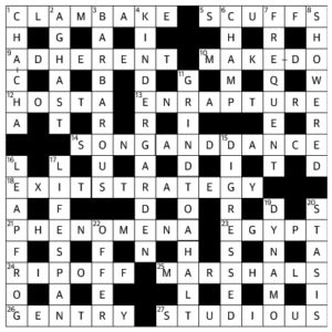 Cheers to Pierre for the blog, and thanks to Carpathian for a fun puzzle that hit the sweet spot for me: not too easy, and not so hard that I couldn’t suss out the tougher ones. I got a bit stuck at the end at the cross between AGHAST and HOSTA, not knowing the slang meaning of tile, but nothing else fit for AGHAST and “host” means “present” so I figured HOSTA must be one of the myriad plants unfamiliar to me. I loved the long anagrams for KINDERGARTEN and GRIND TO A HALT.