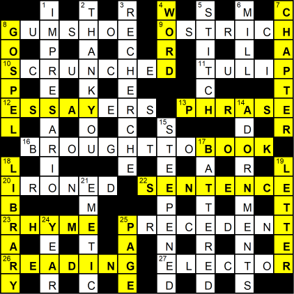 At first I was focussing on 12a as the centrepiece of the theme, taken in by the red herrings GUMSHOE AND STITCH, but then I did some more READING of the grid. We have many literary elements, from a single LETTER right through to a whole LIBRARY:
