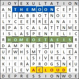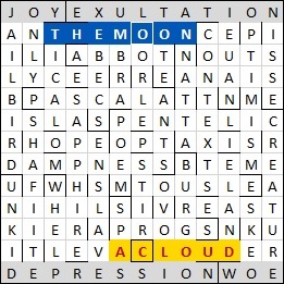 The four abstract nouns in the highlighted entries, indicating the nature of the theme, were clear to see. In the penumbra, as it were, THE MOON and A CLOUD could be made to appear in the rows next to the top and bottom, but finding the right word or words across the middle (in the umbra, so to speak) took much longer. I tried various possibilities, including HYPER…, before hitting on …STASIS, which I admit was rather lucky, as the answer then came pretty quickly. A very nice way to resolve the theme.