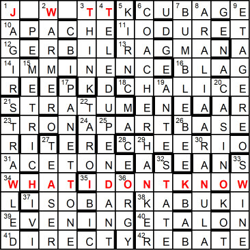 34a | WHAT | Pardon bowler maybe after wide (4) | |