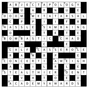 More indicators that don’t indicate what the solver needs to do in this typical offering. Two or three poor entries too, with ABJECT APOLOGY, ARTISTIC ABILITY (not phrases one would expect to find in a crossword) and the awkward SAMBA-ING.