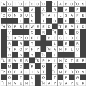 Wasn’t very impressed with KILT or BESIDE. Not quite sure about IMPROV, either. Didn’t really enjoy the solve that much, whether one should award COOs or the BOOS this morning…
