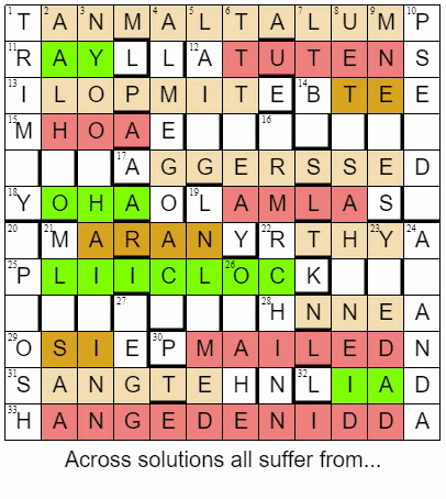 At some stage, as a few more Across clues started to take shape, with differing wordplay results/definitions and some helpful crossers, there was a first PDM as I twigged that the jumbling seemed to be just the middle letters – RAYL -> RYAL, OSIE -> OISE, RTHYA -> RHYTA, LAMLAS -> LLAMAS.