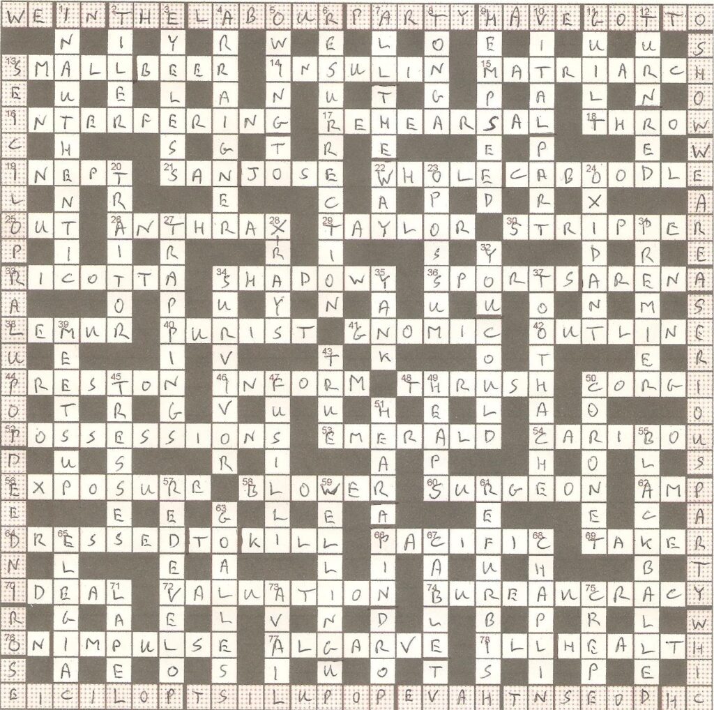 In truth no single clue was tremendously difficult but because of the special nature of the perimeter, there are spots where there are fewer crossing letters than usual. This particularly affects the corners, and the shorter clues therein, for instance 70A and 71D, both 5 letters, had only 1 checked letter each on my grid till after I got that part of the perimeter message.