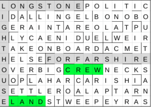 Shifting CREW from the BIG HARCAR rock to sit above LAND, changing SETTLER to the unfortunate SCREWER, was clear enough, but it took me a while to convince myself that I needed to sink the stern (SHIRE) of the ship to occupy the space formerly occupied by EYRAS, partly because I didn’t think to Google for ages that the unlikely looking FORFAR is in fact a town north of the border. Geography has never been my strong point.