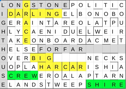 Shifting CREW from the BIG HARCAR rock to sit above LAND, changing SETTLER to the unfortunate SCREWER, was clear enough, but it took me a while to convince myself that I needed to sink the stern (SHIRE) of the ship to occupy the space formerly occupied by EYRAS, partly because I didn’t think to Google for ages that the unlikely looking FORFAR is in fact a town north of the border. Geography has never been my strong point.