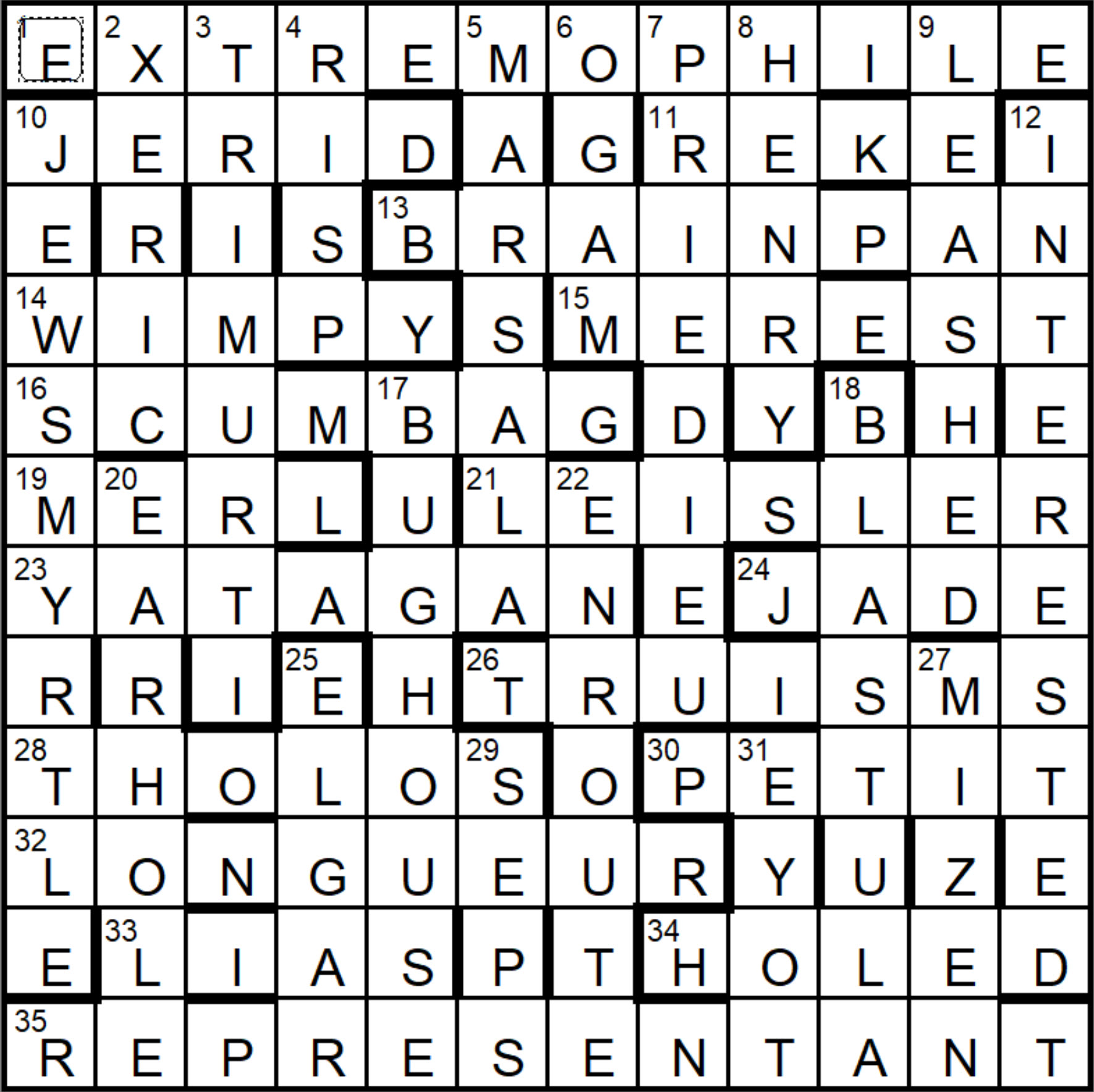 Some of the unusual words this week I have come across in barred crosswords before, e.g. PRIE-DIEU and BLASTULA, but a few others were completely new to me including JERID, YATAGAN, XERIC and TRIMURTI.