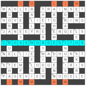 I found the crossword an easy solve with some delightful clues, especially 6 (MAHLER), 13 (ENGELS), 15 (CROSSWORD EDITOR) and 29 (NOODLE).