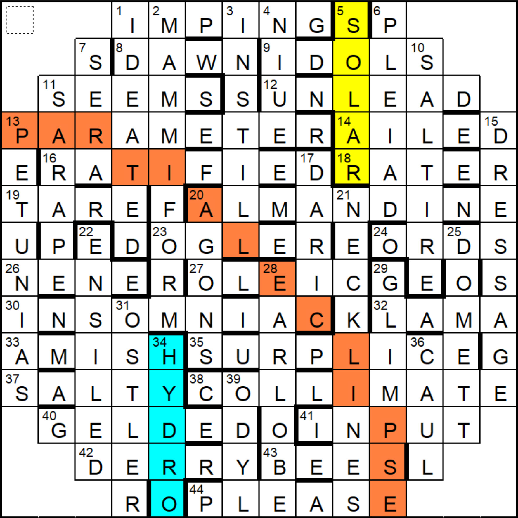 This was a very satisfying puzzle to finish. The endgame required a bit of thought before I saw what had to be done, but it was all resolved without any problems. I saw the phrase PARTIAL ECLIPSE last of all, as it was partially eclipsed by my shading! Like Arnold, I shaded the area to the SW of (as well as) PARTIAL ECLIPSE.
