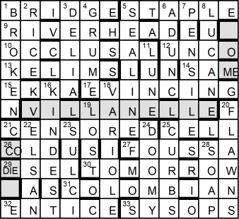 Some of the perimeter grey cells must contain multiple letters; the other two overlong answers must be shortened (into new real words) before entry. Numbers in brackets refer to spaces available. The unclued entry is a codename (in Chambers) which must be adapted into the theme (two words); the titles of two (literary) sequels explain how solvers must next modify the contents of another ten cells (creating new entries). Finally, the isolated grey cells must be filled to identify who’s played the ARRIVISTE. Chambers Dictionary (2016) is recommended.