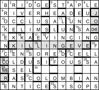 Finally, DIE for ME resolved the puzzle of why I hadn’t quite managed to fit JODIE COMER into the perimeter grey cells. Swapping the two cells containing these words duly identified her.