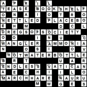 21 | HOT-WATER BOTTLE | Container prone to leaking – ridiculously wet, total bother (3-5,6) (WET TOTAL BOTHER)* AInd: ridiculously. Another great surface reading. We’ve all had leaking H-W bottles haven’t we? |