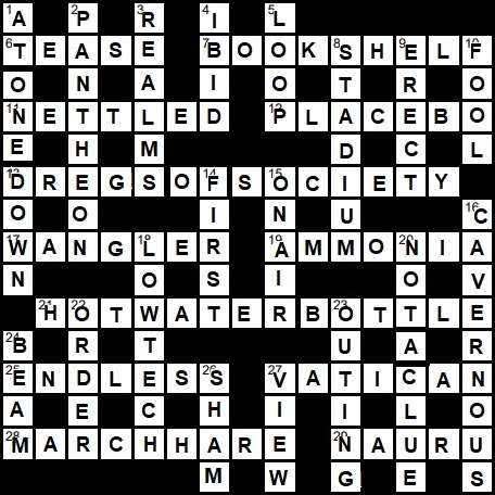 So I started with 24D Beam, solved that and 28A March Hare with no difficulty – both good clues and no fooling me with some American Politics reference. The trio of other crossing downs also fell easily enough meaning 25A could only be one thing ENDLESS and the apparently self-referential clueless clues were explained. Very nice joke.