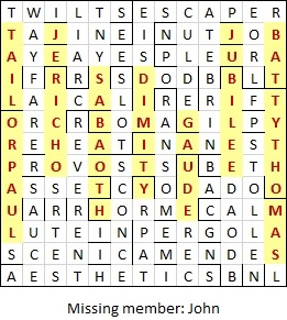 Anyway, the top right corner yielded and it was definitely BATTY THOMAS I should be searching for, so I Googled again. The trail quickly led to The Nine Tailors by Dorothy L. Sayers; and of course the extra letters should spell GAUDY NIGHT, a title I was familiar with from way back. But now the flood gates were open … TAILOR PAUL, JERICHO, SABAOTH, DIMITY, GAUDE, JUBILEE were speedily slotted in, leaving John as the missing member to be named below the grid.