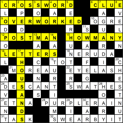 He also manages to include a reference to a joke about a CROSSWORD CLUE: OVERWORKED POSTMAN.