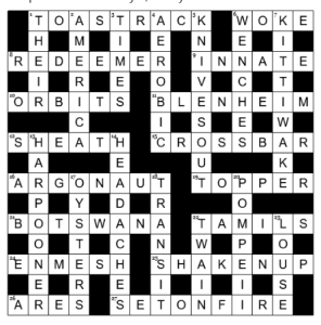Annoyed to have failed with BOTSWANA even though I had twigged that a first A was going to be moving to the right! I ran through my mental list of sailors – and even considered ‘bosun’ but not ‘boatswain’. It was certainly tricky – took me longer than most weekday Indy offerings so not the gentle start to a Sunday I was expecting. Favourites include BLENHEIM, CROSSBAR, ENMESH, TIMES, WENCHES, OYSTERS, POMPEII and the very neat TWAIN.