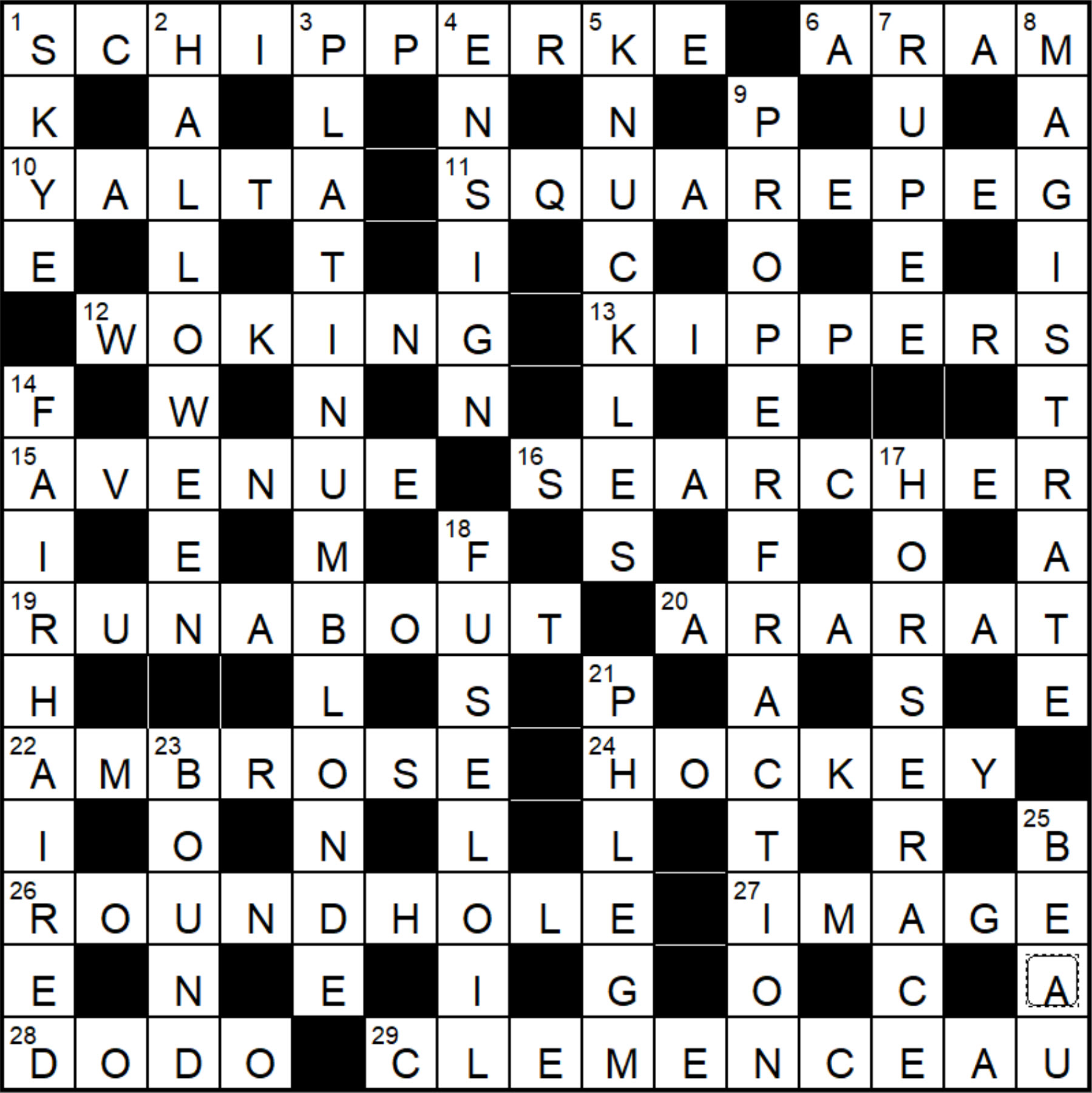 Standard wordplay, although a few of these wouldn’t get past a crossword editor today – YALTA, WOKING, AVENUE, ARARAT, AMBROSE, IMAGE, CLEMENCEAU, SKYE, HALLOWEEN, PLATINUM BLONDE, RUPEE, MAGISTRATE, HORSERACE, and FUSEL-OIL
