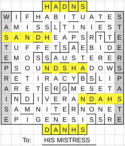If you were familiar with Donne’s work, or had access to the ODQ, I’m sure the endgame was the proverbial walk in the park. As it was here, several increasingly frustrating hours were then spent trawling the internet, and looking for real words which would complete the top and bottom rows.