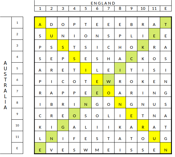 The number of each batter indicates the row/column of each entry; for each row/column clues are in the correct order. A score greater than zero associated with each clue indicates a misprint in modulo 26 somewhere in the clue. So (i) in the first Australian innings, Warner’s score of 61 generates a misprint correction 9 letters forwards or backwards from the letter shown; (ii) in the second innings, the clue is normal, as Warner scored zero. Solvers must highlight a reference to the winning team and their margin of victory in the completed grid, as opposed to what might have been. 8dn (ii) is in SOED.