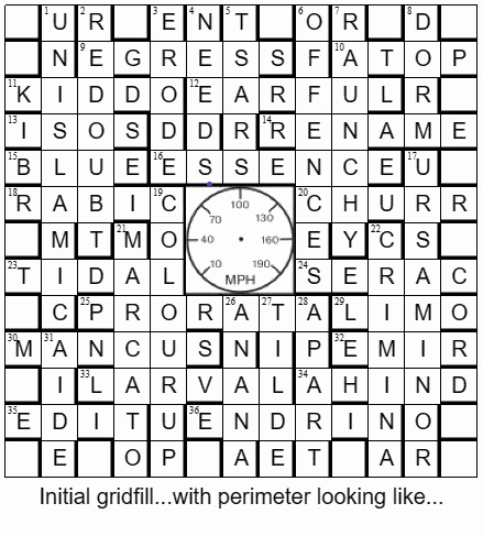 As it was, I went from 0-60 pretty quickly here (or rather 0-36, as a thematic perimeter usually results in fewer clues for your blogger to have to process), with some fairly amenable clueing leading to a fairly rapid grid-fill, and the perimeter gradually filling up with checked letters: