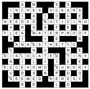 I did this puzzle immediately after another one blogged recently on this site. There’s one clue in this that’s virtually identical to a clue in the other. I won’t say which puzzle or which clue, in case others are going to do that other one in the future. Just a coincidence, no doubt.