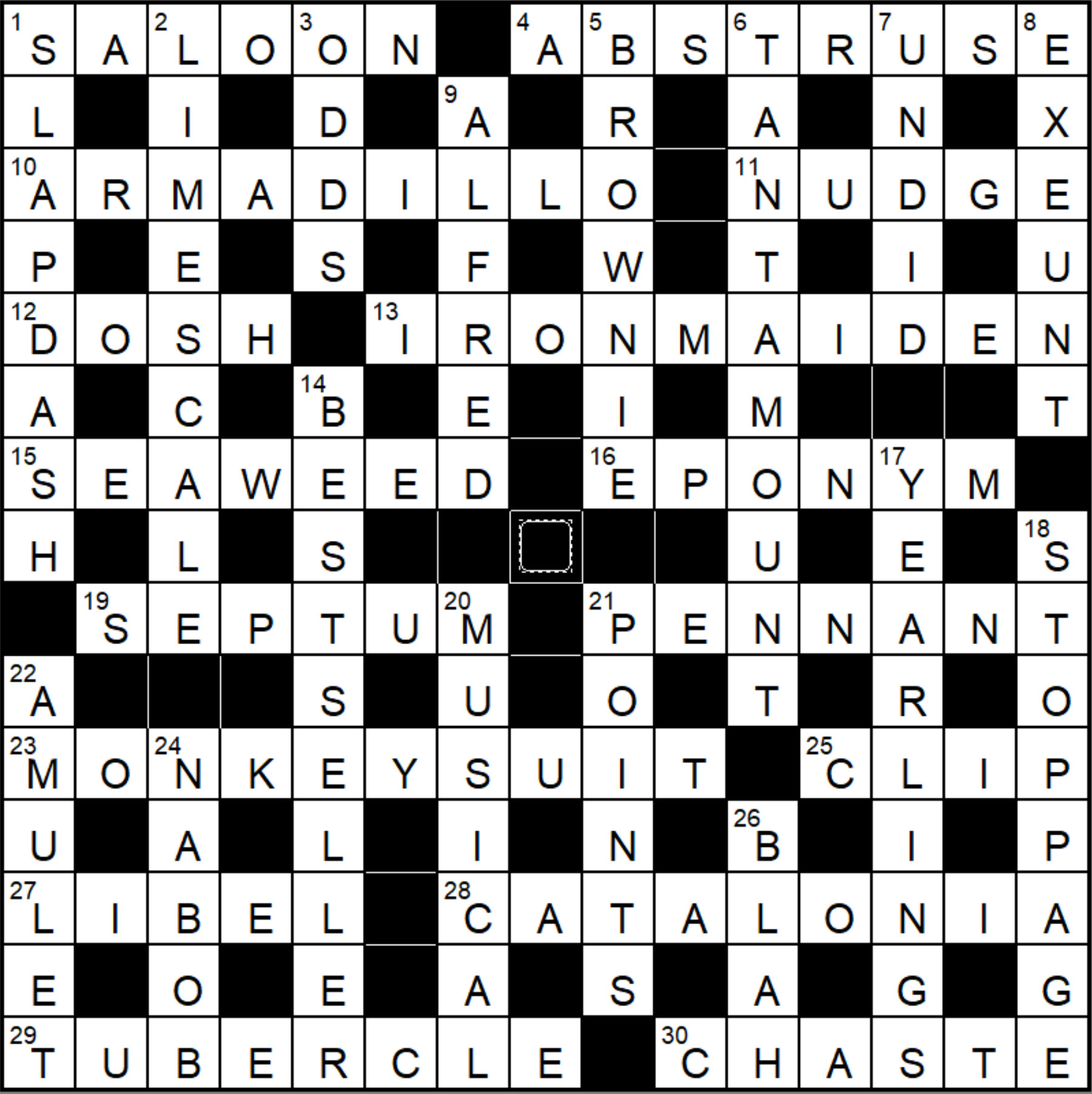 Wednesday is usually a theme free day and I think that tradition is continued today, although I did look to see if there were any IRON MAIDEN album or track titles in the grid. The first 5 unchecked letters in row 2 spell LIDAR which, among other things, is a technology used in land surveying for determining ground heights and contours, but I think that is just a coincidence.
