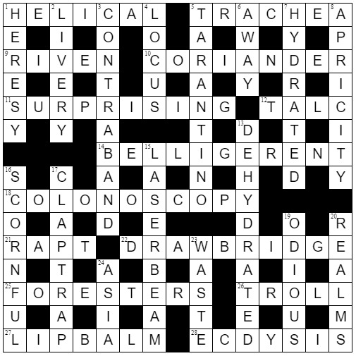 Lots of lovely surface reads and clever stuff – the ‘CleopaTRA CHEAted’clue; the TALC/curry powder clue – don’t want to get those two mixed up!; the use of : in COLONOSCOPY; the TROLL as a ‘gruff hazard’; APRI in APRICITY as a ‘foolish day’…and lots more.