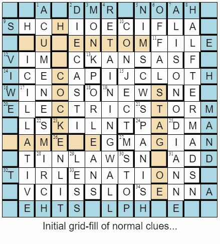 I made reasonable progress through the clues, with the grid slowly filling up, and crossers starting to creep into the perimeter and unclueds. And eventually I could make out NOAH along the top, MAND down the right, PL?S along the bottom, and WIV?S up the left. With a little Wiki-oogling to flesh out my vague Sunday Skool memories, I was able to fit Noah’s three sons, SHEM, HAM AND JAPHETH down the right, and also to add PLUS THEIR THREE WIVES – none of whom gets a mention by name in the original stories, I believe. Finally, with a last few clues in the top left, and cross-checking the unchecked letters from the preamble, I came up with MR AND MRS NOAH to complete the perimeter.