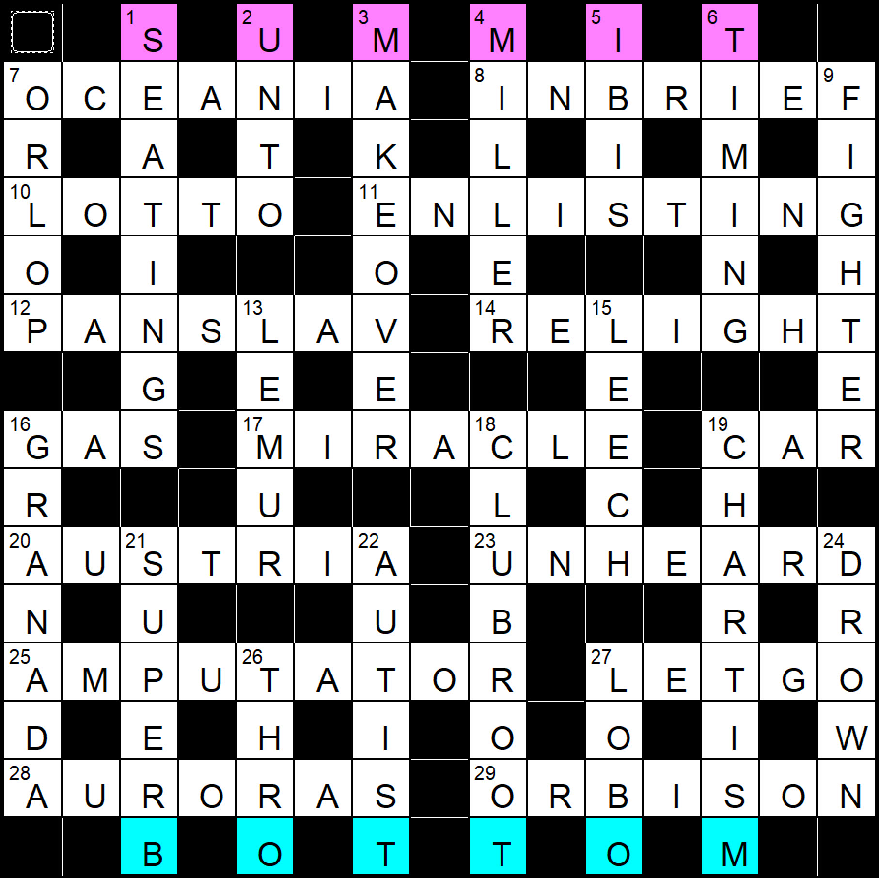 I saw BOTTOM appearing in the top row of unchecked letters fairly early on which gave a hint as to what the message might instruct us to do.  It seemed likely that BOTTOM would be moved to the unchecked letters in the final row to replace something indicating ‘top’ that would itself move to replace BOTTOM.