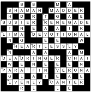I didn’t know MADDER was a plant. Ven/archdeacon eluded me. And I can’t believe that I couldn’t parse CANTER. D’oh!