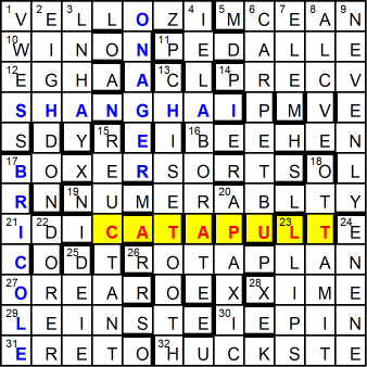 I enjoy most wordplay gimmicks, but find this one of the harder types because the letters to be removed are not only missing from the wordplay but of course not present in the checkers. Still, it all came together slowly but steadily. As “war machine” and “boulders” came into view my first thought was (naturally) TREBUCHET. In fact, this particular weapon of mass destruction (nice play on words there) does not appear. The unclued entries revealed themselves to be SHANGHAI, ONAGER and BRICOLE, each a type of CATAPULT, the third definition of which in Chambers is: