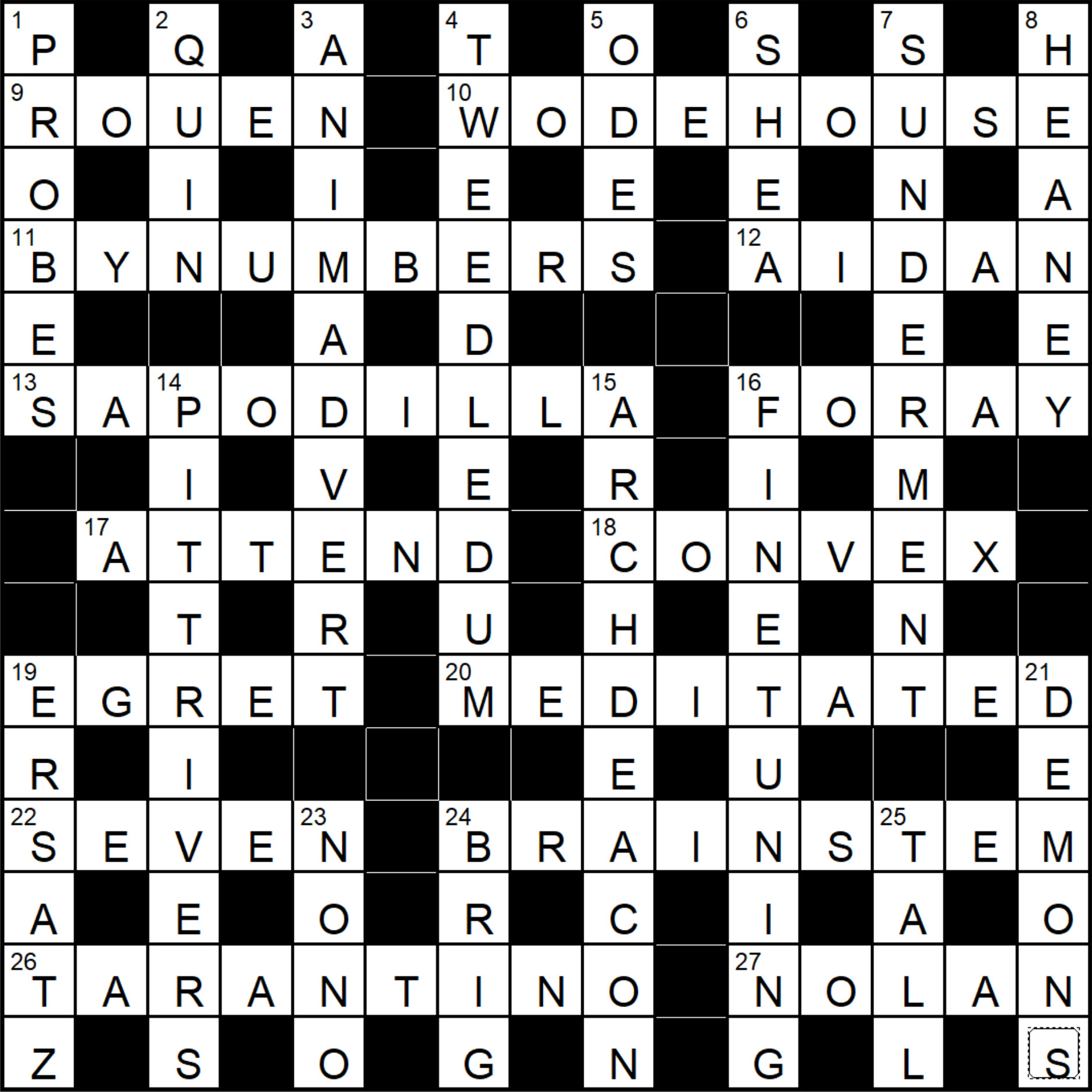 At the risk of sounding smug we got all this without help. We did need a couple of crossing letters for SAPODILLA but PITT RIVERS was a write-in. We took a long time, though, to get FORAY as our LOI. Favourite was SEVEN.