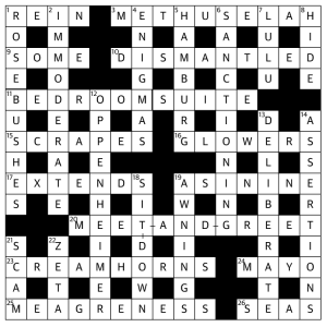 24a: Kicking myself because I couldn’t for the life of me think a three-letter root veg! Then I took out my frustration on Everyman, decrying “mayo isn’t a relish, it’s an emulsion!”