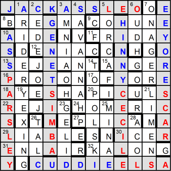 Accordingly, lions are preceded – or led – by donkeys in the unclued grid entries, all neatly fitting into the symmetric pattern. The animals come from various sources, some fictional some real. They were fun to find (except that I was sad to be reminded of Cecil and could say a few choice things about humans). Thanks Eclogue!