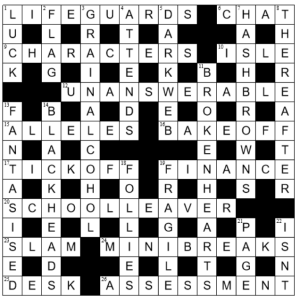 Thanks both. SCHOOL LEAVER stands out, partly from the perspective that nobody to my knowledge has used the appealing anagram fodder before. Anything classical or high-brow tends to perturb me, so FOLLIES was a guess, and CHARACTERS went in with only a little more confidence, as I prefer clues wholly in English. In GRAIN ALCOHOL ‘settled’ as the anagrind still tasks my Monday brain, where ‘unsettled’ would be more obvious but would fail the wordplay