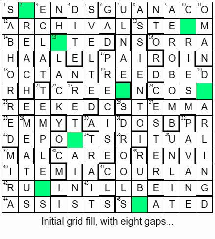 After a cautious first pass or two, several answers seemed to fill their slots, and several seemed to be a bit short – e.g. SENDS at 1A; STEM at 13A; DEPOTS at 33A…and once a few of the correct-length words had been filled in, it started to become apparent where the gaps might be. S_ENDS; STE_M; DEPO_TS; etc.