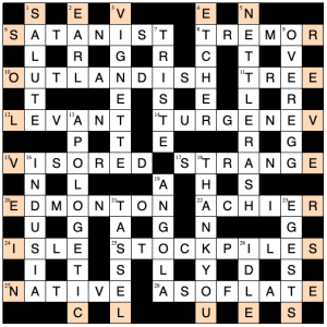 There seems to be no limit to the range of simple but clever technical tricks that setters come up with in this series to spice up a cryptic crossword. In this puzzle I thought I discovered the trick with my fourth clue, OUTLANDISH. I assumed the words of the clue as printed were in random order and should have read “Unconventional saddle is in unconscious husband” (word order now 1, 6, 3, 5, 4, 2), which happens to work just as well as the (far superior) rule to reverse the order. Either way, of course, the surface reading is lamentable, but that hardly matters. I got the actual rule when solving my next special clue (TREMOR).