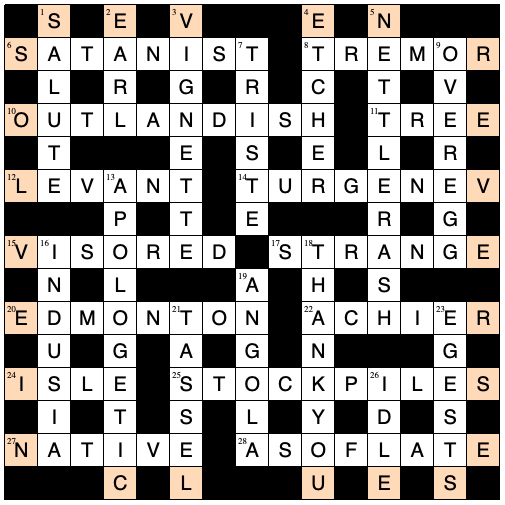 Fortunately several of the ‘normal’ clues were reasonably straightforward, so we managed to start filling the grid fairly quickly, particularly in the SE corner, but ground to a halt with several entries missing. We noticed that the surfaces of some clues didn’t quite live up to the standards we have come to expect from Eccles and eventually recognised some definitions that would fit the spaces available but could not figure out the wordplay – eg 6ac could be ‘TrEmOr’ with ‘shaking’ as the definition in the clue, but no obvious parsing. Eventually after a lot of head-scratching we realised what was going on – the words in the clues needed to be reversed for the wordplay to work (although unsurprisingly the surfaces generally become meaningless). We needed to check the unusual meaning of LEVANT at 12ac and the novelist at 14ac to confirm that we had correctly interpreted ‘manipulation’. When we had moreorless completed the grid we noticed the ‘further information in the grid’ mentioned in the preamble – the Nina in the perimeter unches reading (when sorted into the right order) SOLVE SEVEN CLUES IN REVERSE.