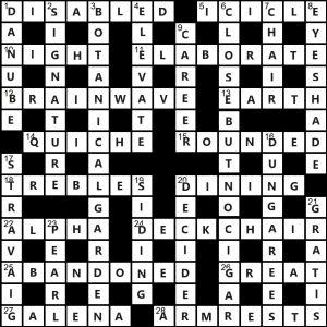 At first I thought it was somewhat on the simple side with the first 10 or 12 answers slotting in very quickly, especially the top left corner which was mostly complete when I began to hit thsomme tougher clues.  14A was the first to keep me guessing – thinking the answer was some “fast food” I’d never heard of.  I took me ages to consider sticking a Q in front of the U – resulting in a sigh-making PDM.