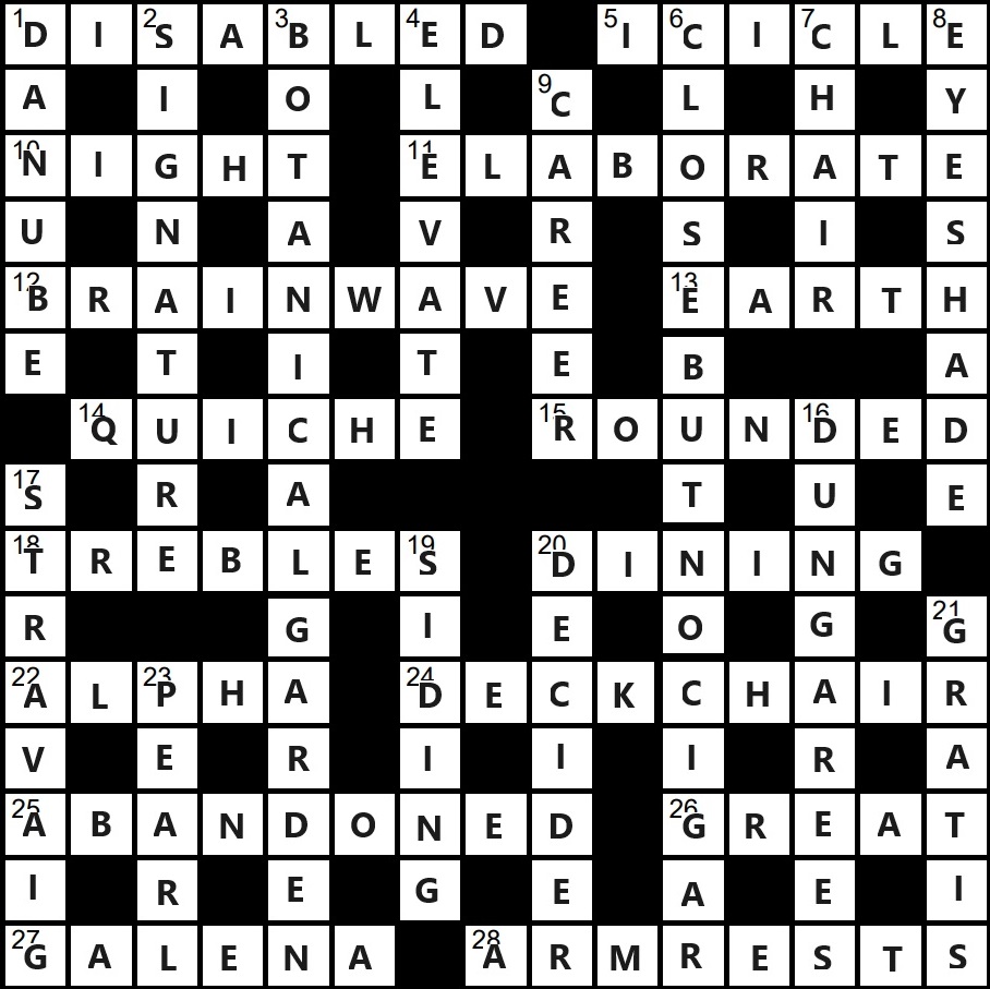Favourites include: “webinar” in “brainwave”; the cunning definition in “alpha”; the beautiful inclusion for “abandoned”; and the CAD for 9d.