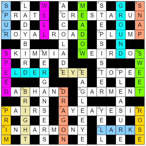 Thanks manehi, no theme and indeed too tough for me today (crossing TOPEE and SWEET) though I may have had a chance (I kid myself) had latter used pass instead of make. Lady Bird also gives her name to the lake in Austin, Texas which is how I know her, following a short stay there. Thanks to others for notes on her and the ROYAL ROAD (no sign of it here, for me). I did manage to construct some new terms from wordplay and always appreciate that, and thought AYE AYE SIR was excellent. Thanks Brummie.