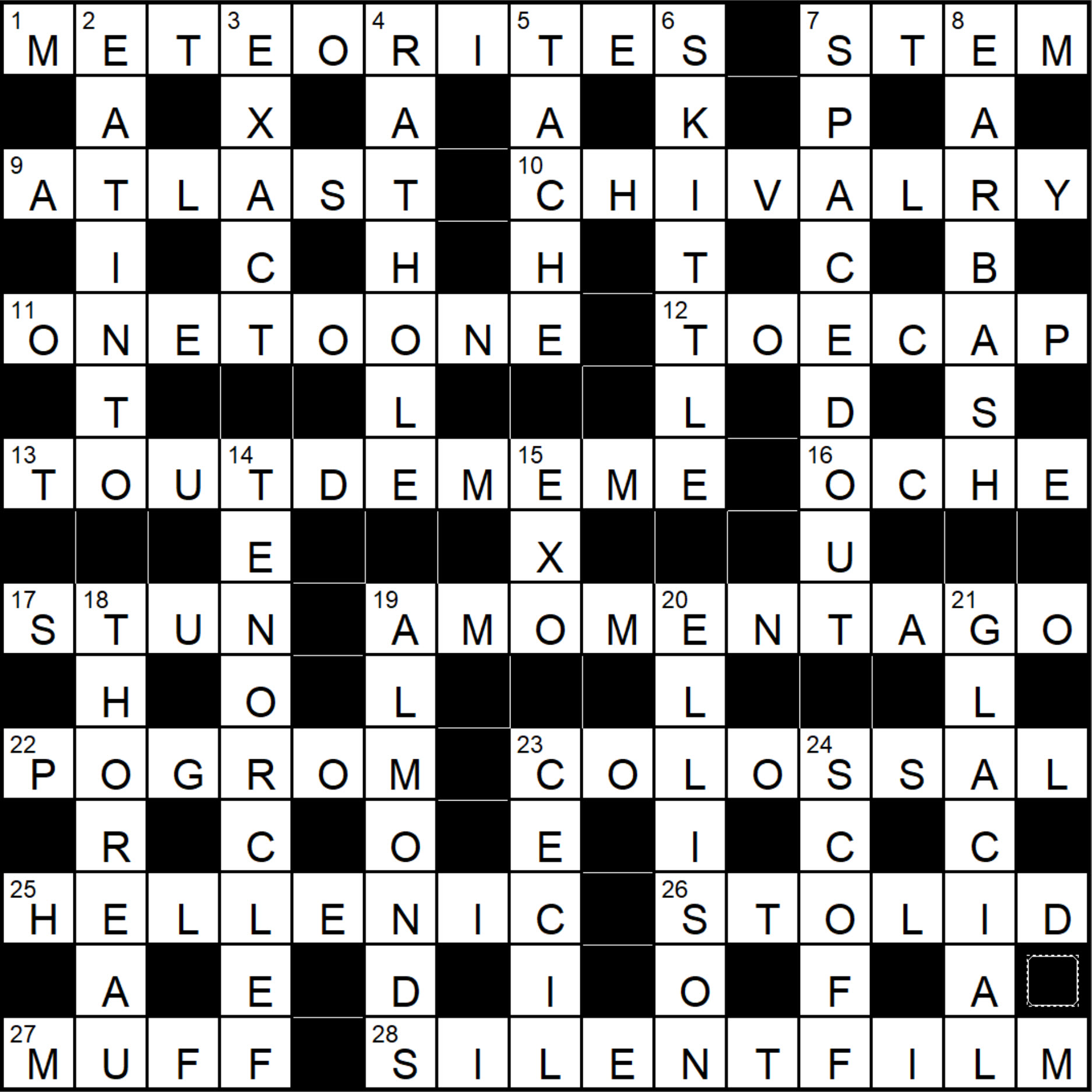 | 23 | Huge firm with a large holding in forfeiture (8) COLOSSAL (huge) (CO [company; firm] + A + L [large]) containing (holding) LOSS (in forfeiture) CO (LOSS) A L |