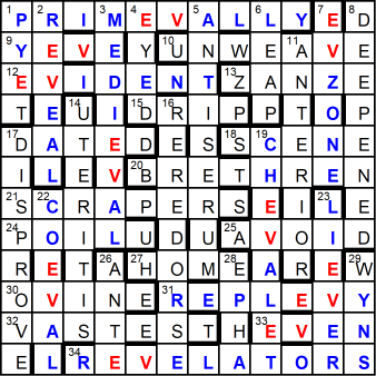 REAL and REPLY came early, and I noted that these were both two letters too short for the space available. Once I had solved IDENT I saw that I could add EVs to give REVEAL, EVIDENT and (with the help of Chambers!) REPLEVY. That also shed light on an entry I had been struggling to make sense of: PRIMEVALLY. It was all much easier from here, although I did make good use of the emerging message to help me in the NE corner. This message revealed itself to be:
