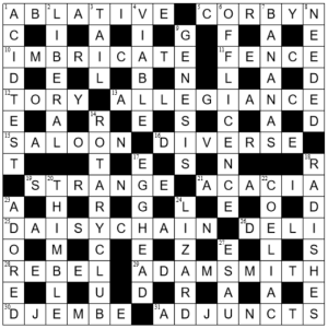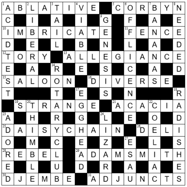 Lovely puzzle, great blog and pertinent comments. I went down a rabbit hole after KVa’s post about Adam Smith. Could one of the DJs be Fat Boy Slim? Can ABLATIVE be both relative and absolute? And as Simon S says, Corbyn is on the right and Tory is on the left.