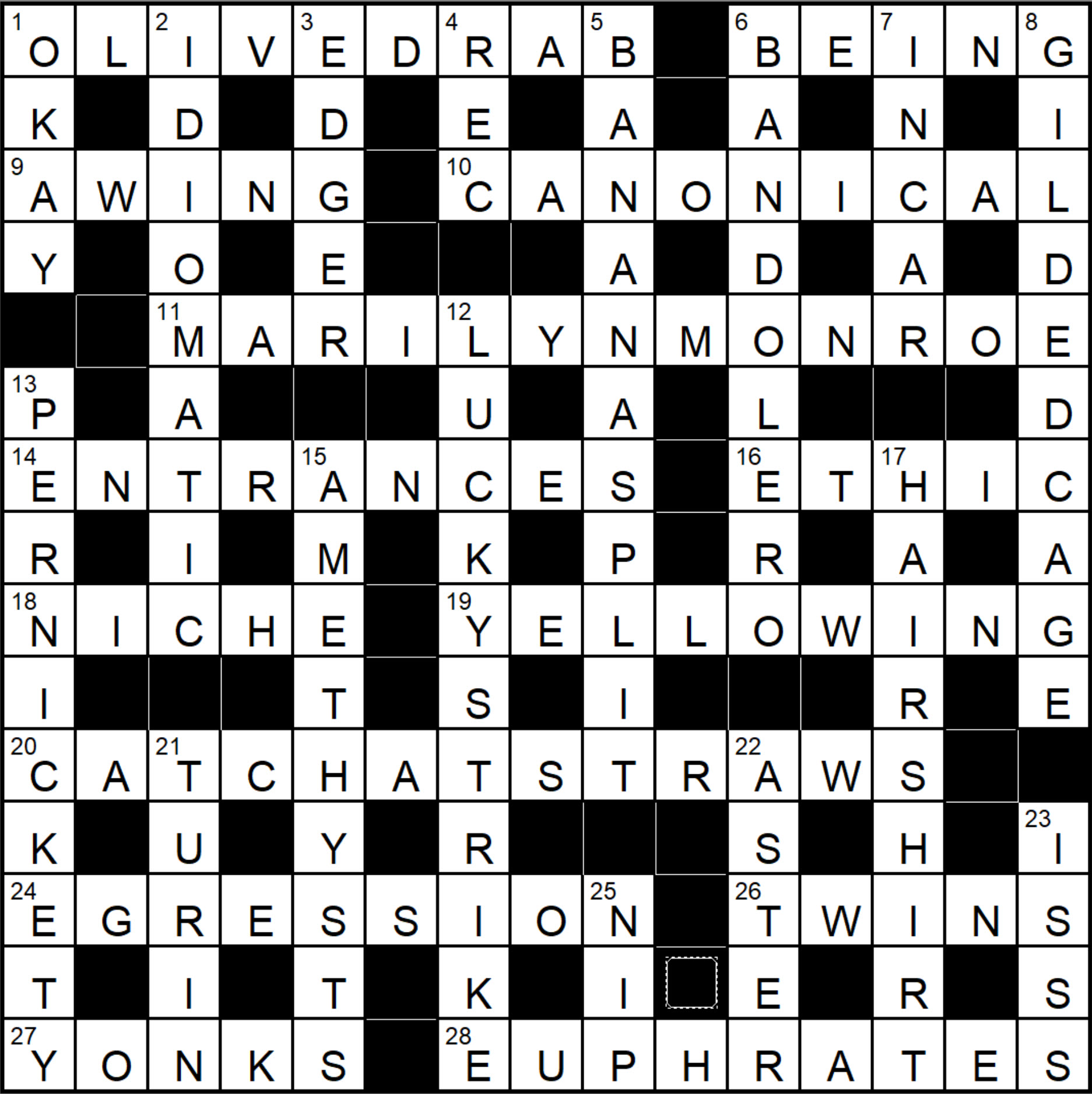 Thanks Filbert for an excellent crossword. This took a bit of thought and in several spots I went down the wrong rabbit hole. I did somehow complete this, albeit with gaps in my parsing. My top picks were MARILYN MONROE, NICHE, TWINS, and PERNICKETY. Thanks duncanshiell for the blog.