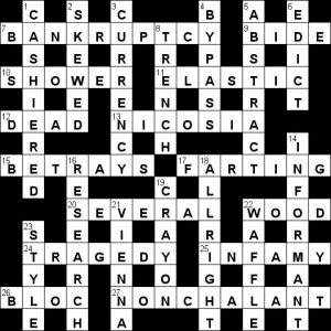 17 | FARTING | Distant object, not hard, acting as a windbreaker (7) FAR T[h]ING (distant object – H[ard]) LOI: Last One In. I needed the third crossing letter – it was the “T” that gave it away. |