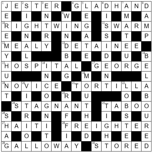 | 1A | JESTER | Comic‘s dig about senior Tory leaders? (6)